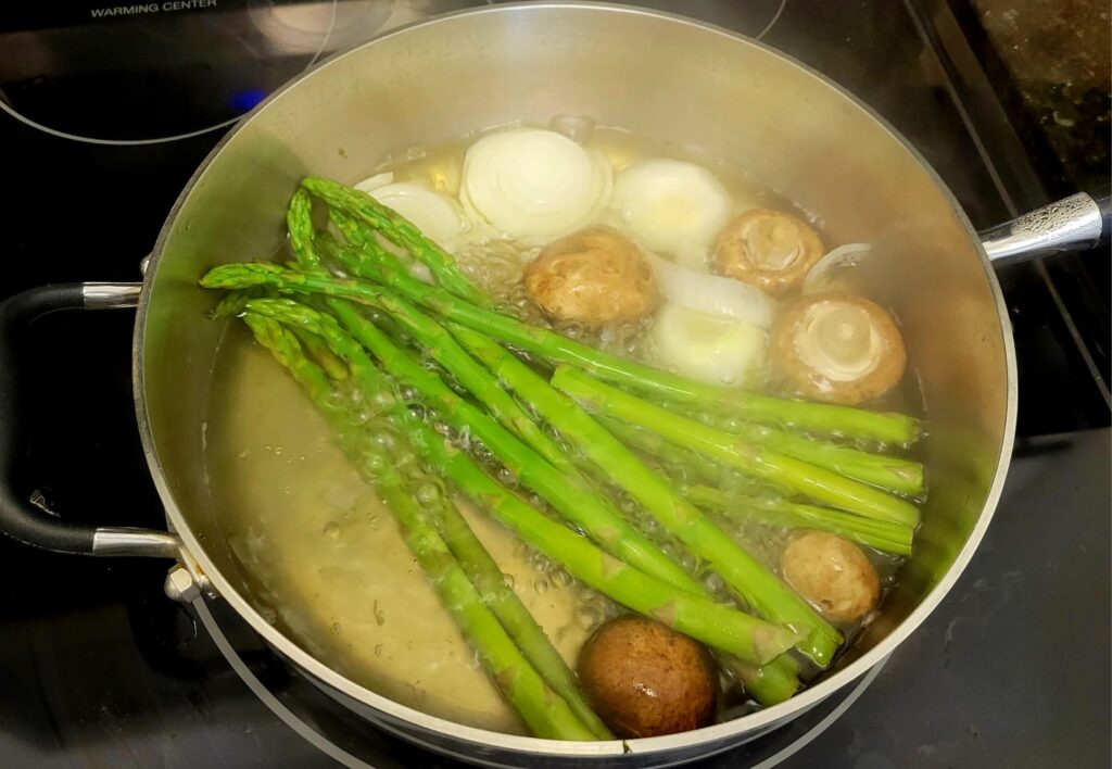 Mientras tanto, en un sartén grande colocar el agua, cebolla sin cáscara y partida en rodajas. Se deja hervir y luego se colocan los espárragos y 10 champiñones previamente lavados. Se dejan hervir en el agua y se le baja el fuego para seguir cocinando por 5 minutos más y se retira del calor.