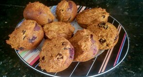 Horno se precalienta a 325F y se dejan en el horno por 60 minutos. Se chequea con un cuchillo y si sale limpio los muffins ya están.