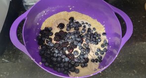 - Ha llegado el momento de unir las dos mezclas 1 y 2 y ahora si agregas los arándonos y las moras (ya partidas en la mitad).